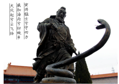 刘邦被人称为赤帝子,战国时期魏国丰邑中阳里人,华夏族。出身平民阶级,秦朝时曾担任泗水亭长,起兵于沛(今江苏沛县),称沛公。秦亡后被封为汉王。后于楚汉战争中打败西楚霸王项羽,统一天下。公元前202年2月28,刘邦于荥阳氾水之阳即皇帝位,定都长安,史称西汉。成为汉朝开国皇帝,庙号为高祖,汉景帝时改为太祖,自汉武帝时期司马迁开始,多以最初的庙号“高祖”称之,谥号为高皇帝,所以史称汉高祖、太祖高皇帝或汉高帝。他对汉民族的统一、中国的统一强大,汉文化的保护发扬有决定性的贡献。