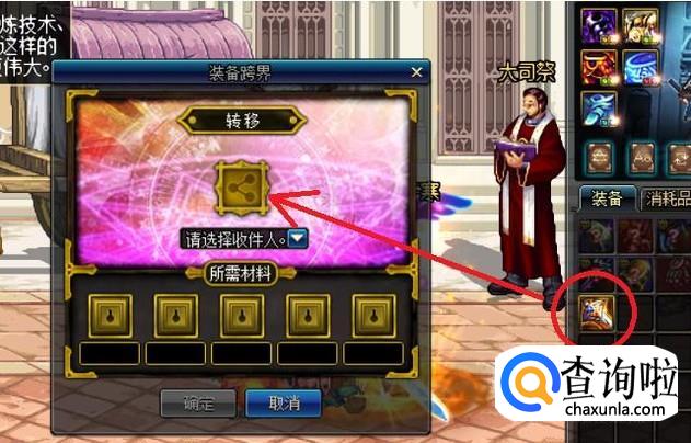 准备好转移该装备所需的史诗灵魂、上级元素结晶、史诗碎片以及精炼的时空石后,点击确定,切换至目标角色,即可在邮箱中接收该史诗装备。