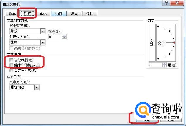 出现“自定义序列”面板,我们点击其中的“对齐”标签,然后勾选“自动换行”和“缩小字体填充”(如果需要字体不缩小,也可以不选缩小字体,然后拉宽单元格),点击确定。