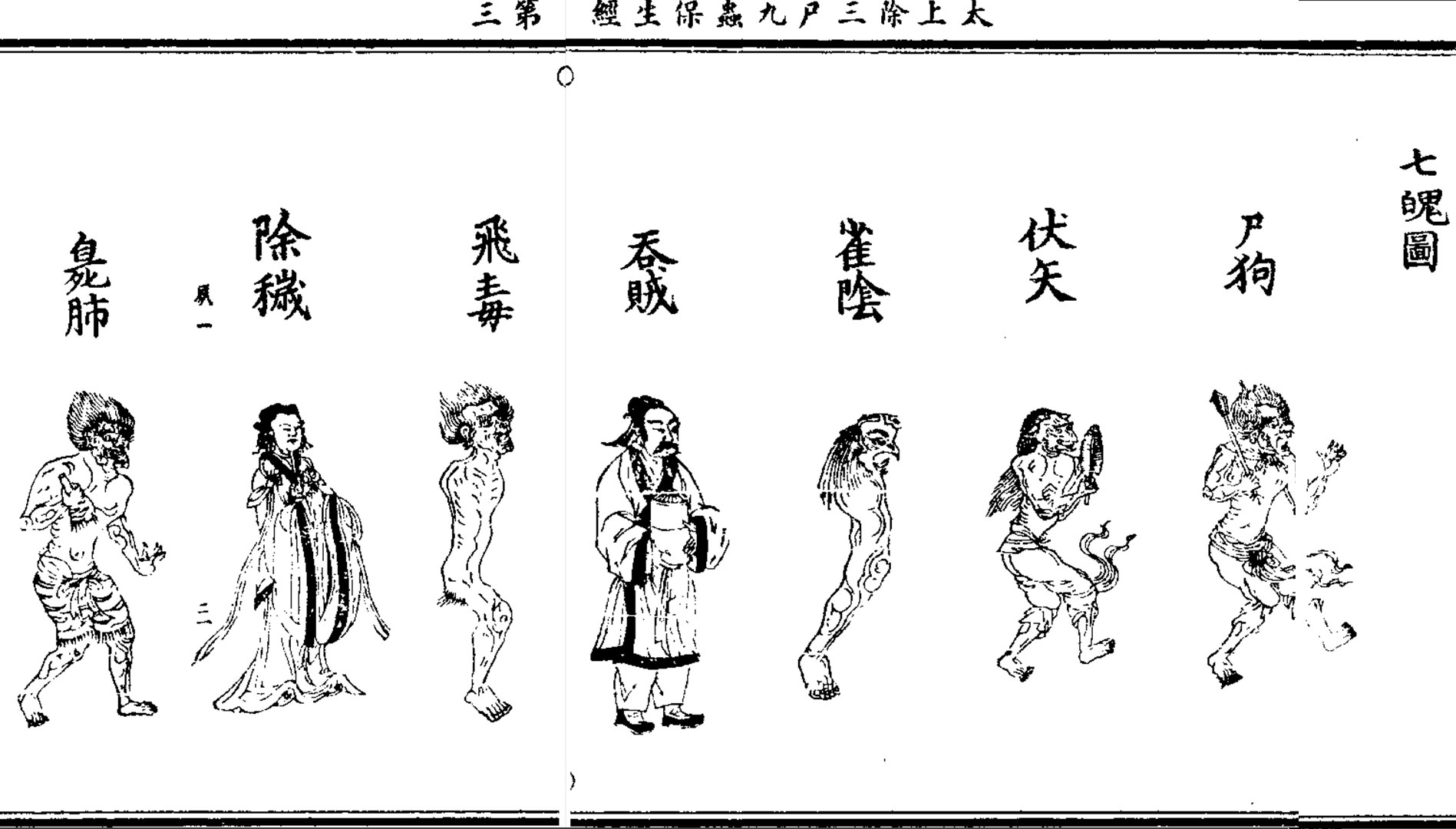 三魂:胎光;爽灵;幽精。七魄:尸狗;伏矢;雀阴;吞贼;非毒;除秽;臭肺。
