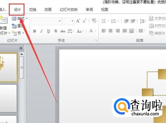 在PPT的菜单栏中点击“设计”选项,如图所示。