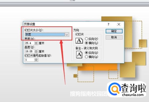 在“页面设置”选项卡中,点击“幻灯片大小”进行设置,如图所示。