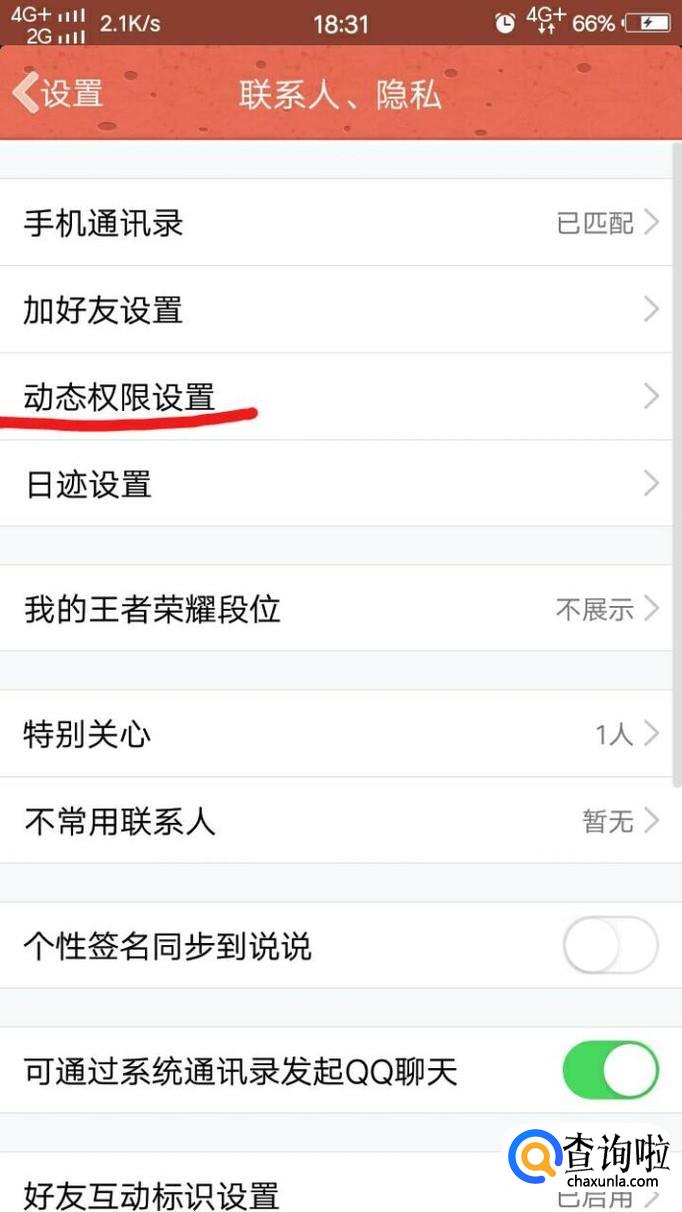 接着,我们点击“联系人,隐私”,然后再点击动态权限设置。