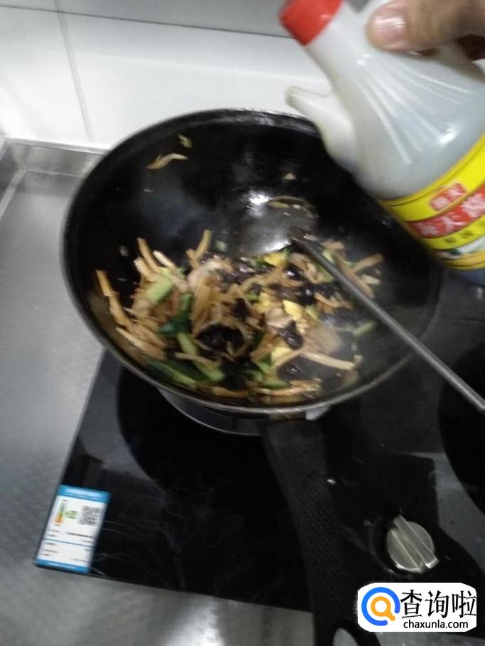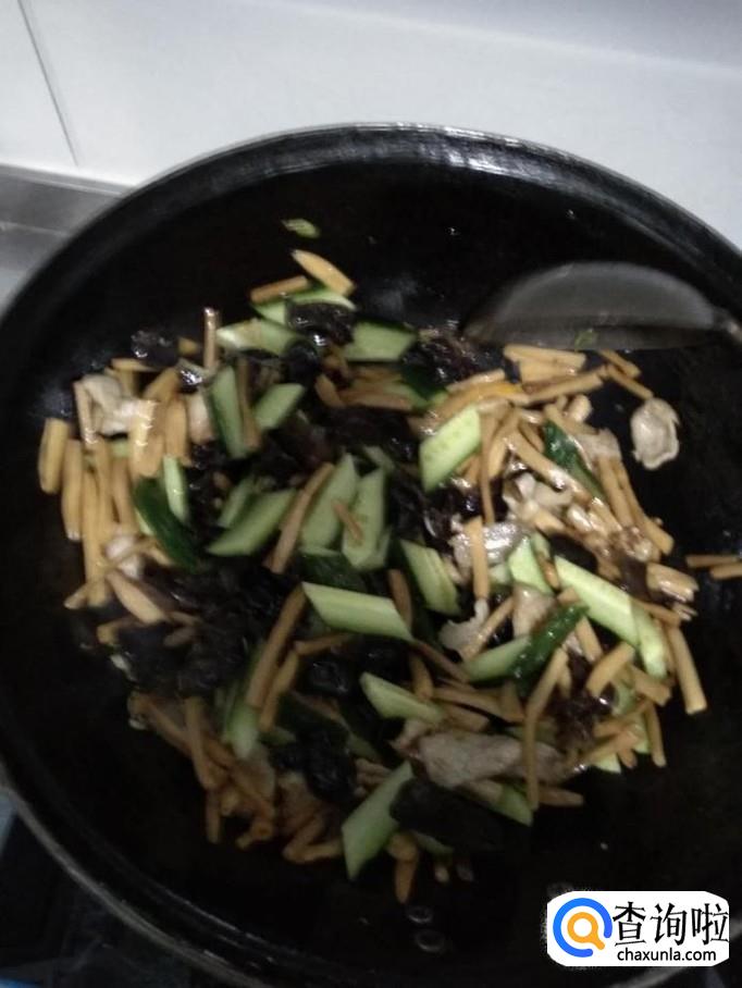 接着倒入木耳至锅内均匀加热2分钟后,依次倒入黄瓜、黄花菜、半熟的肉片,进行翻炒。