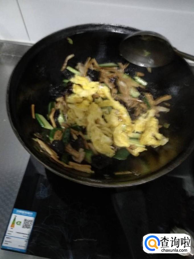 加入鸡蛋,继续翻炒至锅内肉片、鸡蛋全熟。