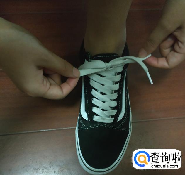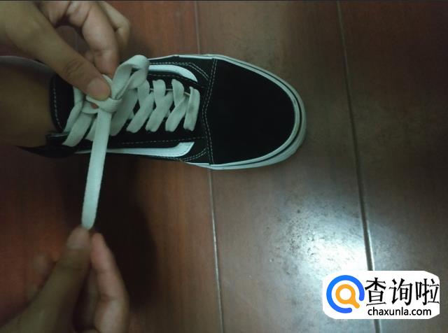 最后用手将纳入开口的耳朵捏住,另一只手拉住另一个耳朵,拉紧两个耳朵,鞋带就系好了。
