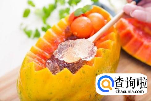 将蒸好的桃胶倒入木瓜中,再倒入牛奶,放上适量冰糖,