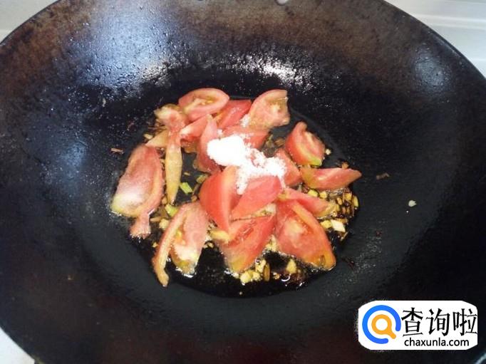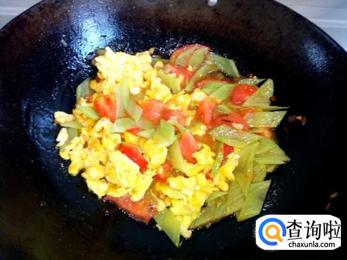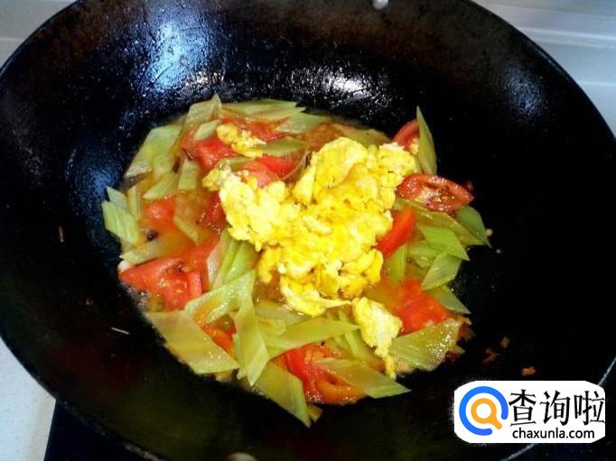 炒至西红柿变软,下汤汁,放入莴笋略翻炒一下即可,然后把炒好的鸡蛋放入锅中,放入盐。