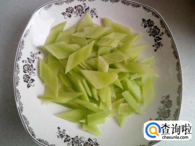 莴笋去皮用水清洗干净,控干水分,切成菱形片。