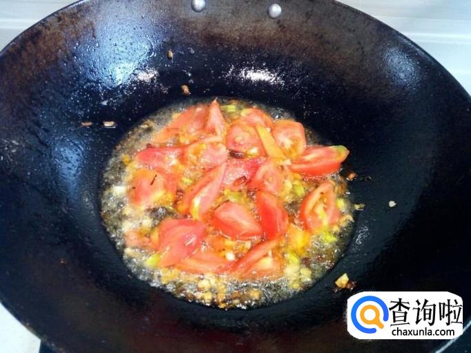锅内放入油加热,油热后放入花椒,葱,姜,蒜爆锅。放入西红柿翻炒,放少许糖(根据个人喜好,也可以不放糖),放少许料酒。