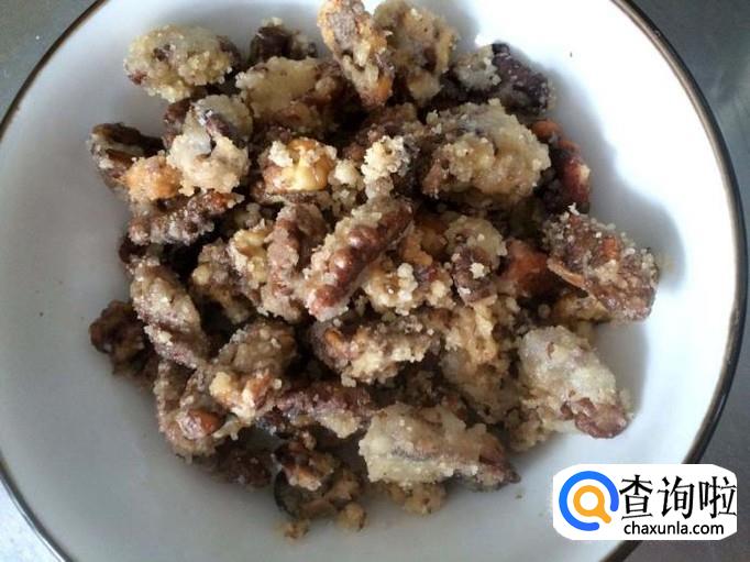 当核桃仁炒至酥脆时,将核桃仁盛到碗里。