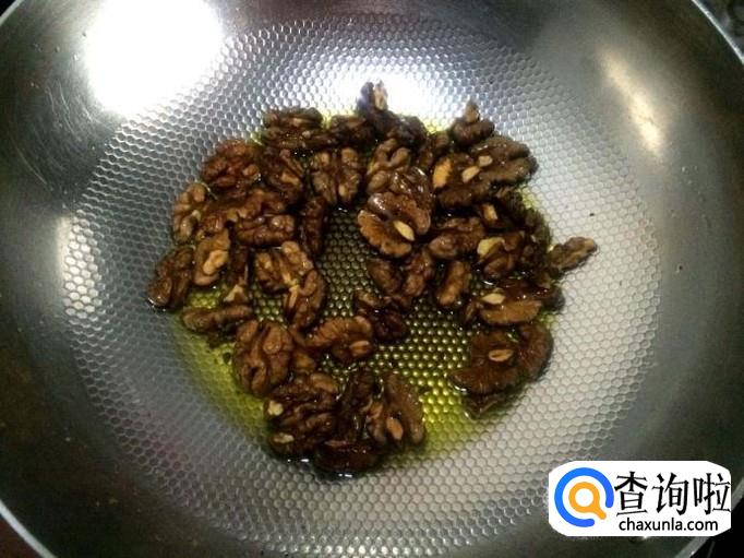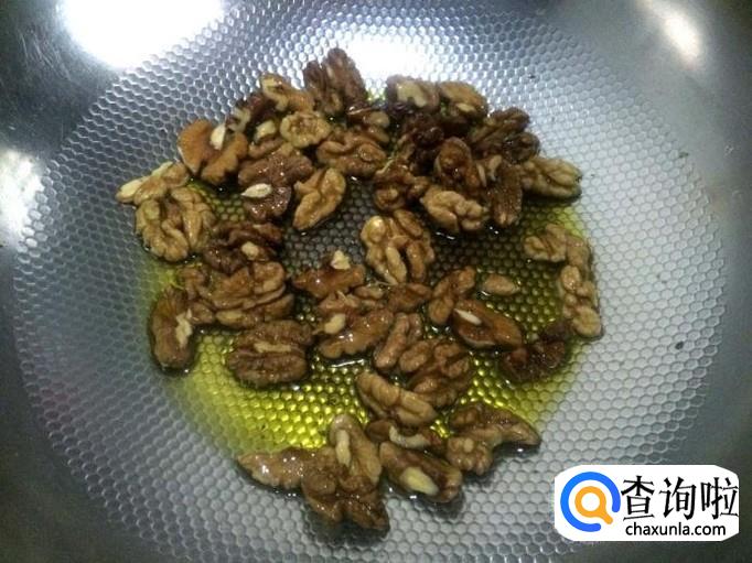 起锅烧热,下油烧至四成热时,转小火,将核桃仁倒入锅内不断翻炒。