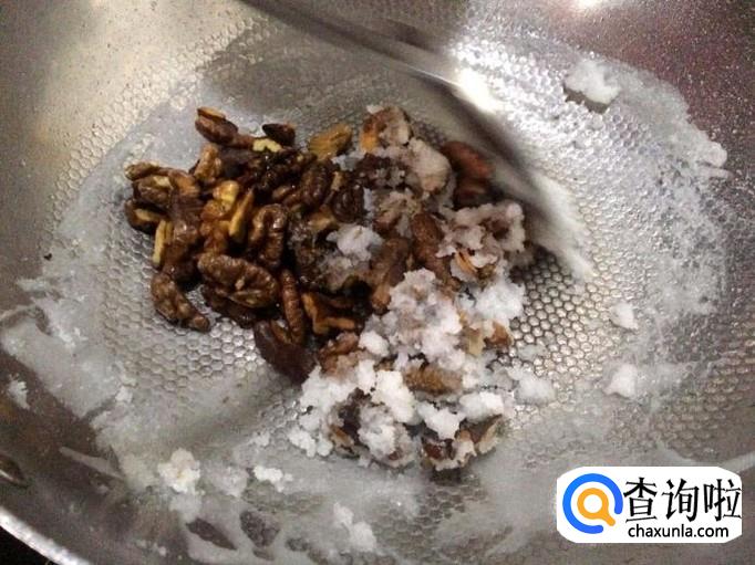 将核桃仁倒入糖浆快速翻炒,让核桃仁尽量均匀裹上白霜。