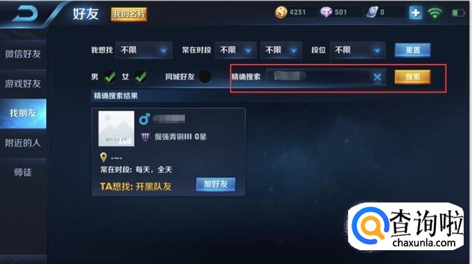 点击“找朋友”按钮后,在图中框起来的地方输入对方游戏ID,点击搜索即可。如图