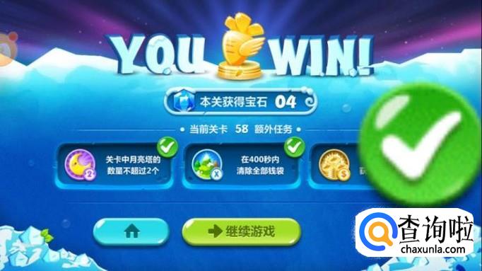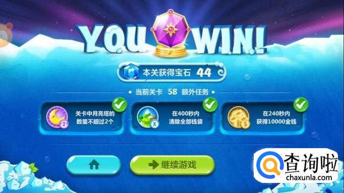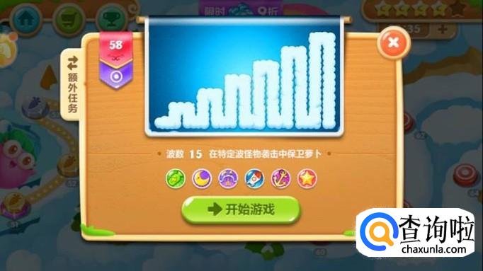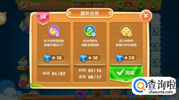 查看额外任务。这一关的三个额外任务:1.关卡中的月亮塔不超过两个。2.在400秒内清除全部钱袋。3.在240秒内获得10000金钱。第二三个任务都是关于打钱的,看来这一关快速清除钱袋十分重要。