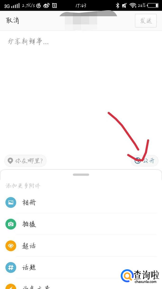 你可以编辑一个你现在想发送的微博,比如你现在的心情。你可以选择这个微博公不公开,如图1箭头所示。