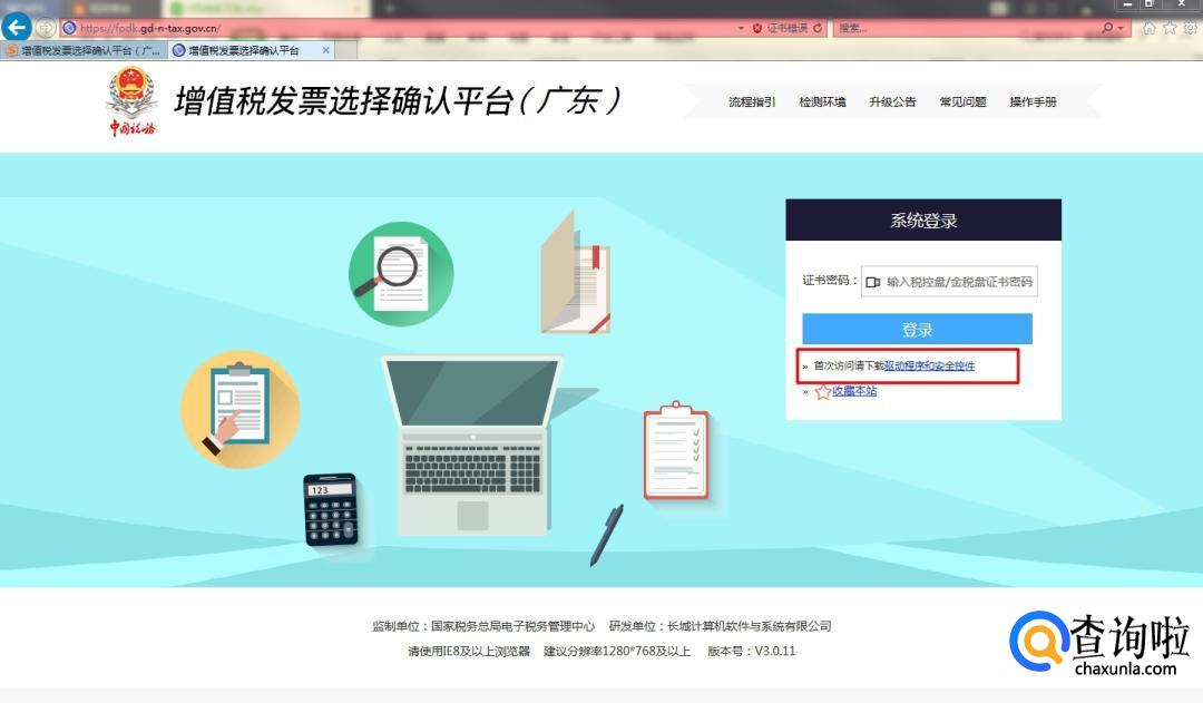 我们就进入了增值税发票选择确认平台的网页,如果你是第一次登入就要下载“驱动程序和安全控件”,安装完成后在主机插入金税盘或者是税控盘。在输入框中输入密码,点击“登录”选项。