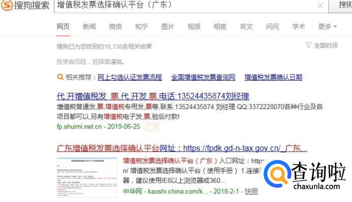 首先,我们在搜狗浏览器里搜索“增值税发票选择确认平台(地区名称)”。