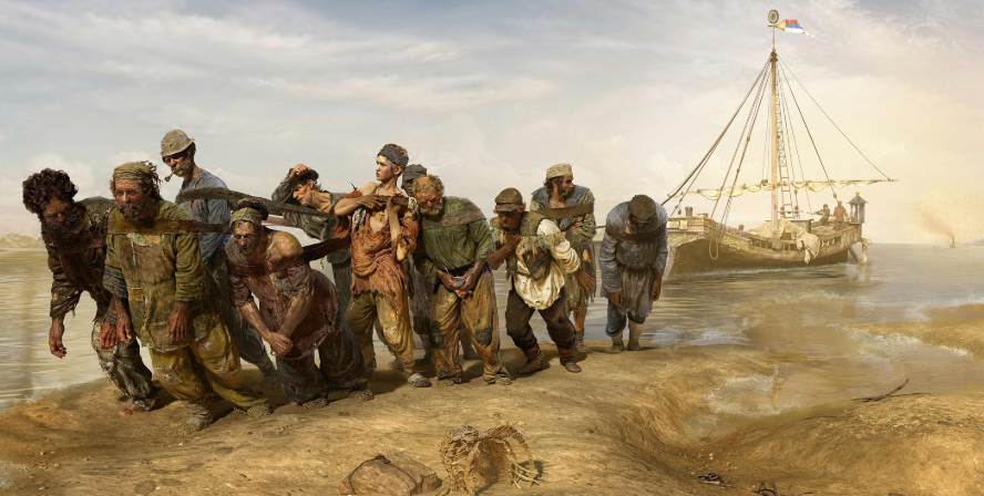 画作内容:该画描绘了被烈日炙烤的焦黄的河岸上,一队蓬首垢面、衣衫褴褛的纤夫拖着沉重的脚步拉着货船,在酷日下精疲力竭的向前挣扎。他们中有老有少,个个都衣着破烂、面容憔悴。领头的是一位胡须斑白的老者,眼睛深陷,坚毅的面孔透出饱经风霜的智慧,但愁苦的表情仍然显示了他对于艰苦生活的无奈。