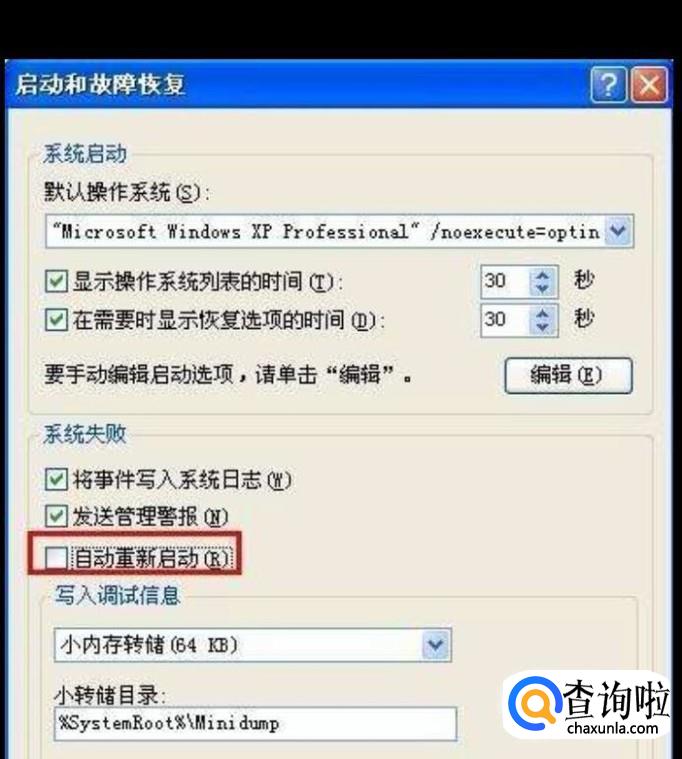 点击设置后会弹出这窗口,在系统失败选项下的将自动重新启动前面的勾取消就可以了。