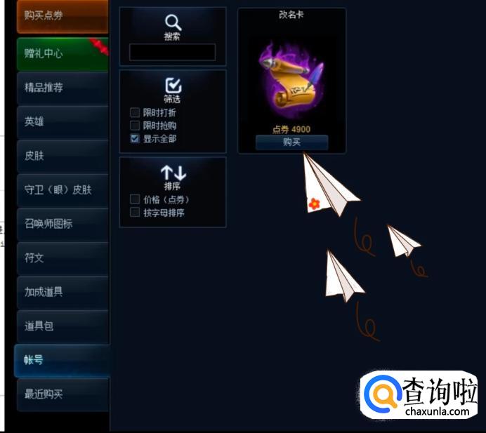 点击商城右上方的账号,便会出现“换名卡”的字眼和选择框,点击便可以进行购买哟,当然资本不够就有可能换不了英雄名字。
