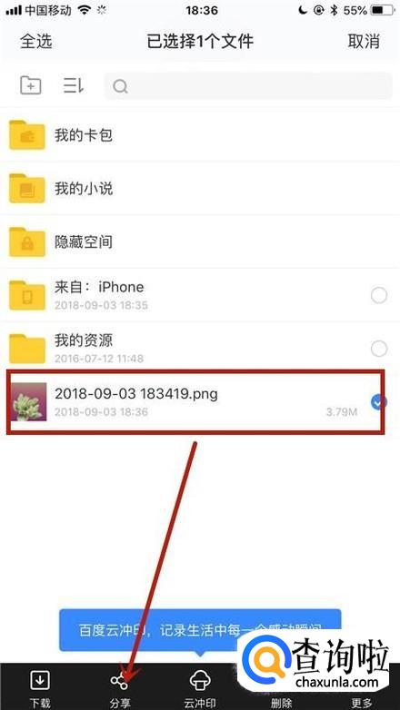 然后选择一个要分享的文件并点击分享,如下图所示。