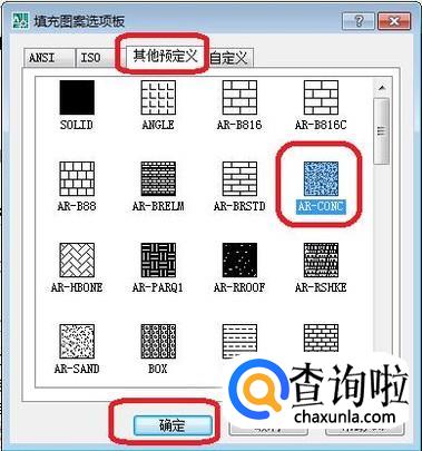 然后,我们填充第二种图案,重复上述步骤,我们选择第二种图案为“其他预定义”下面的“AR-CONC”,点击确定,设置比例为0.2。