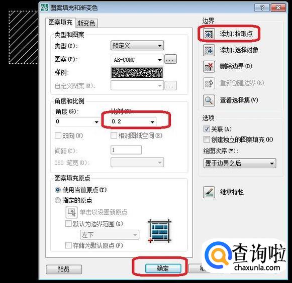 之后,我们还需要设置一下比例,如图所示,设置比例为5(我是根据经验设置的,可以根据视觉效果调整数值),点击“添加拾取点”,选中方框,至出现图中虚线样式后,点击确定,第一种图案就填充进去了,效果如下。