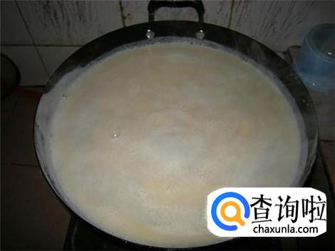 豆子浸泡好之后,放进豆浆机加清水磨成豆浆,然后过滤出豆渣,豆浆放进锅里煮开。