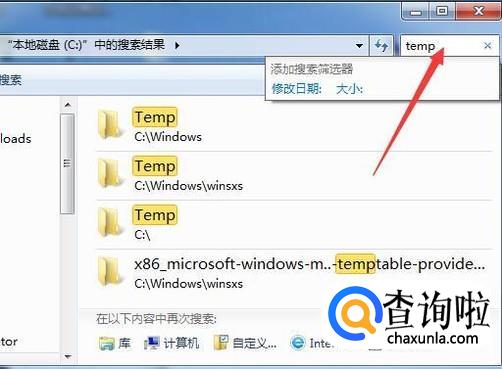 接下来在地址栏后面的搜索框中输入temp,系统进行查找。