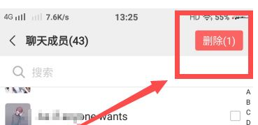 4、点击之后,就进入【删除成员】的页面,找到你需要踢掉的人,点击一下就可以勾选成功了。