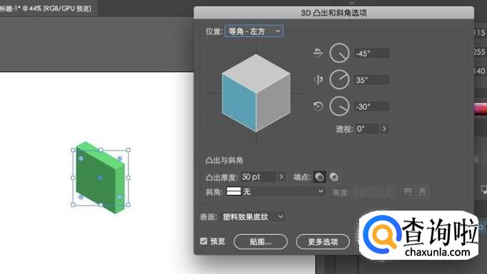 在3D凸出和斜角选项界面,根据预览效果对位置、凸出厚度效果进行调整,就能够得到立体图了。