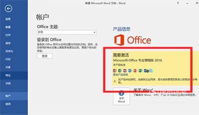 在文件菜单中,选择帐户页签,可以看到Office 2016的状态是需要激活,点击激活的按钮。
