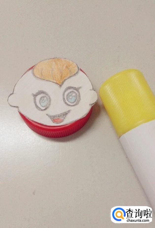 然后把画好的娃娃用剪刀剪下来,剪的时候不要把娃娃的头剪坏了,剪坏了也可以重新再画一个,把娃娃用胶水贴在瓶盖上。