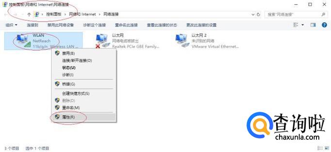 如图所示,唤出"网络连接"选项。鼠标右击"WLAN"图标,弹出快捷菜单选择"属性"项。