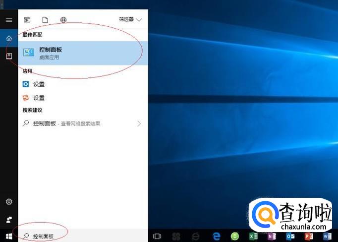 如图所示,搜索框输入"控制面板"。Cortana(小娜)显示搜索结果,点击"最佳匹配→控制面板"项。