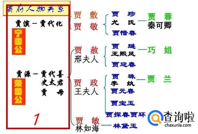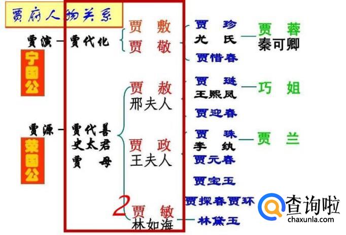 第二层为贾代化的儿女们,分别是贾赦(儿媳妇刑夫人),贾政(儿媳妇王夫人),贾敏(女婿林如海)。还有就是贾代化的儿女们,分别是贾敷,贾敬