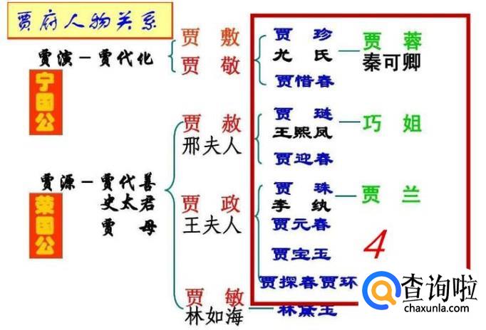 第四层为贾珍之女贾蓉(女婿秦可卿),贾琏之女巧姐,贾珠之女贾兰,贾敏之女林黛玉