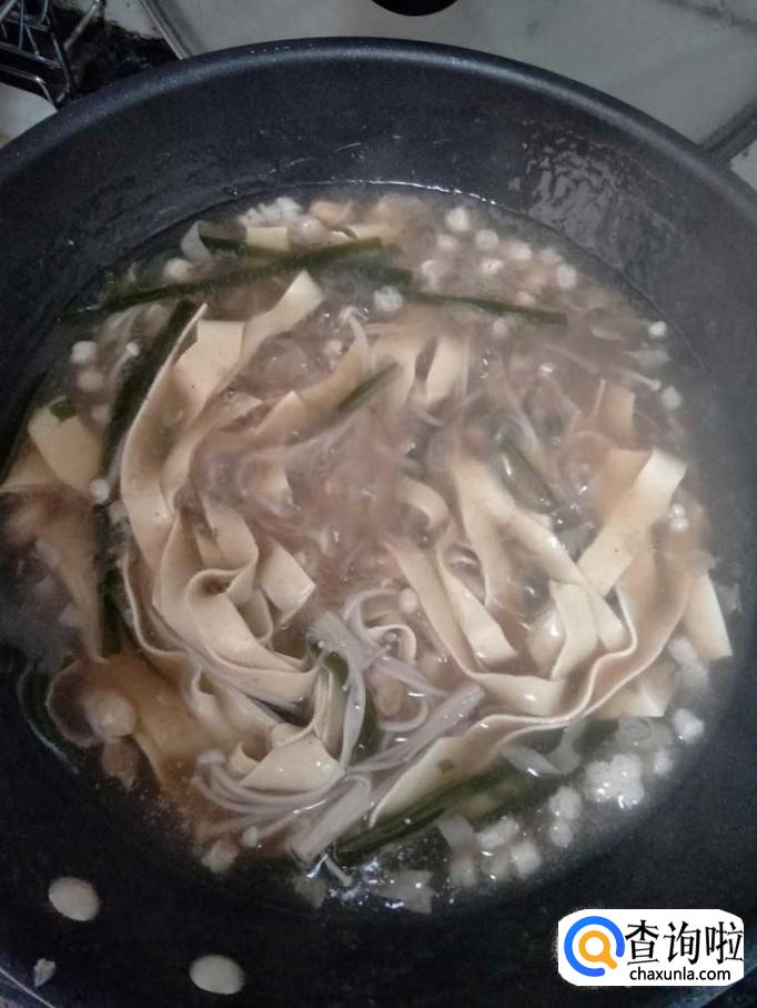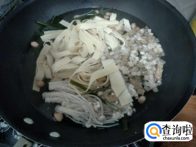 等水沸腾之后,加入金针菇、千张、海带。