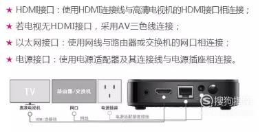 机顶盒连接方法如下图,首先找到包装盒中的HDMI线和机顶盒背后的HDMI插孔,与电视机相应的数据源接口相连,找到机顶盒后的电源接口,链接电源,按下机顶盒电源按键。