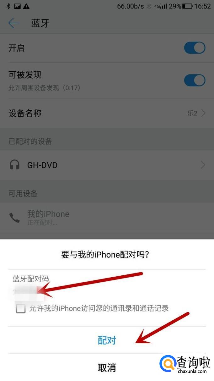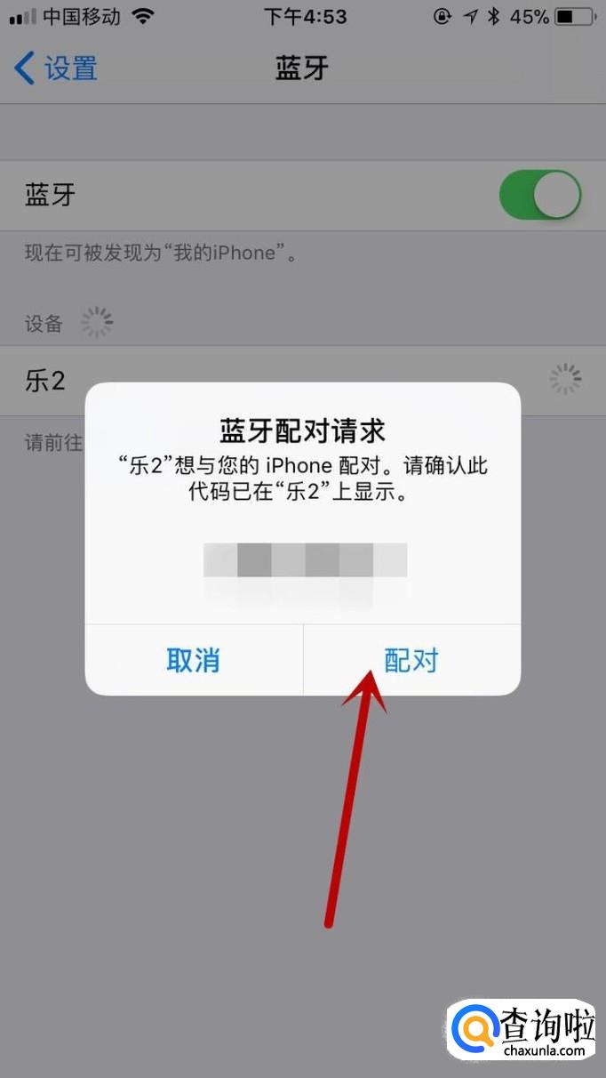 在苹果手机的界面里就会出现如下的界面,我们可以看到一个配对码和安卓手机的配对码是同一个的;我们点击“配对”;