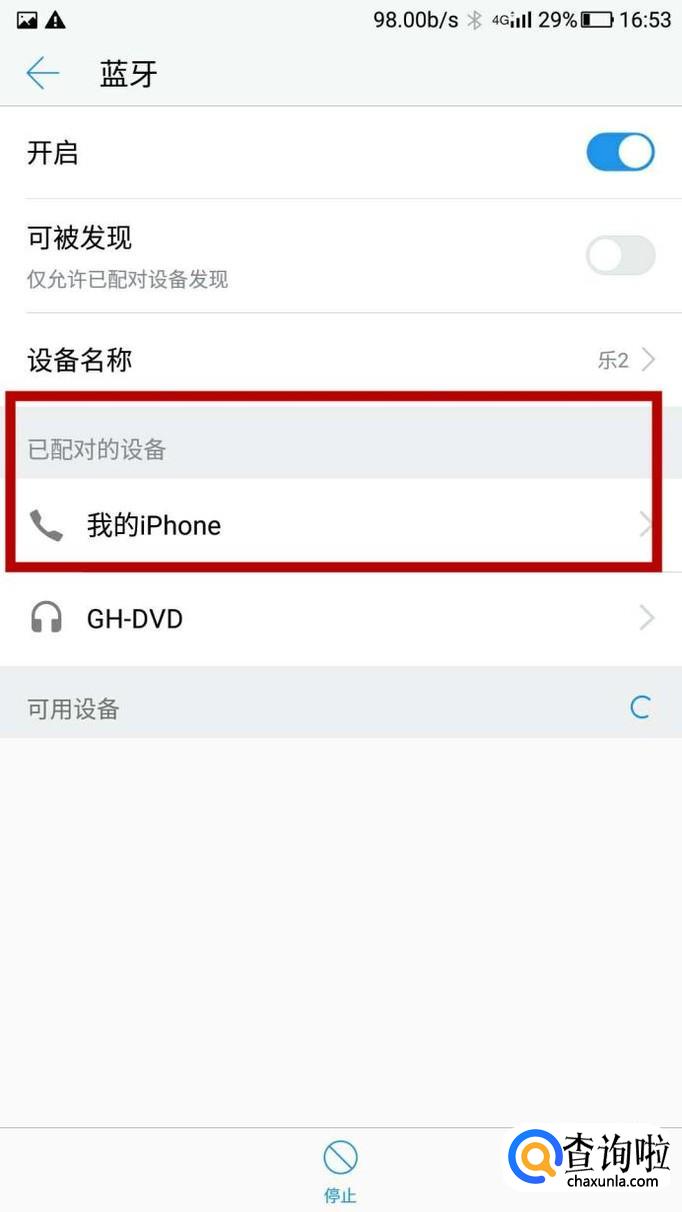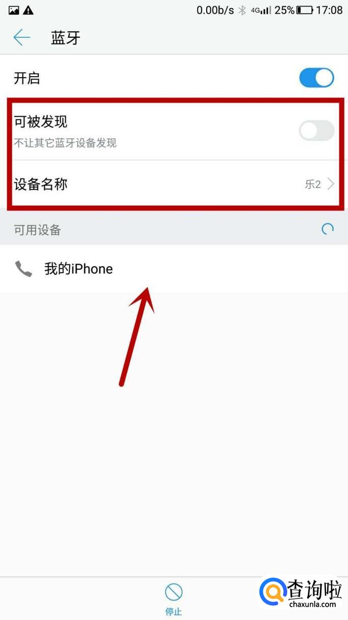 界面就会变成如下所示,我们将 可被发现 旁边的按钮也点一下;我们可以看到我们的设备名称为 乐2;