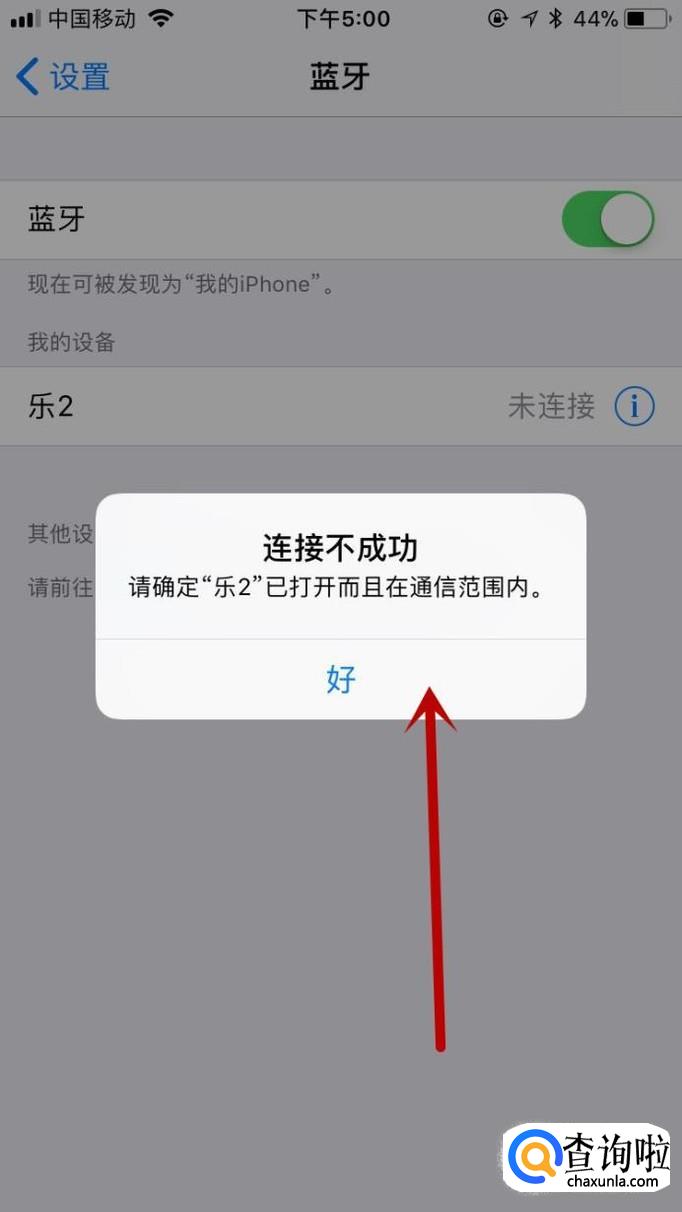 我们如果在苹果手机上点击一下 乐2,就会出现如下图所示的界面,点击一下 好;这个界面说明连接不成功;