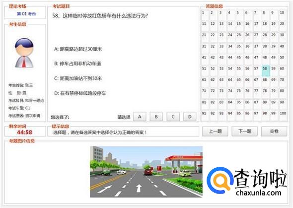 在科目一进行考试的过程中,我们可以根据他的题目来判断,如下图所示。在左下角也会有剩余时间,所以说我们可以通过看时间来决定自己的答题速度。