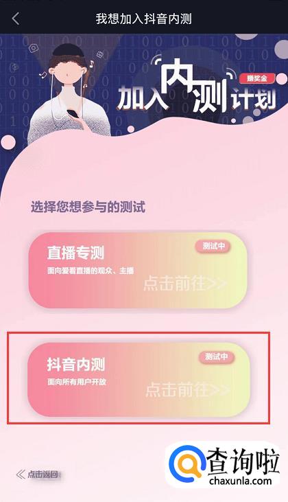 点击之后,选择你先想要参与的测试,有直播专测和抖音内测,这里我们选择【抖音内测】,点击进入。