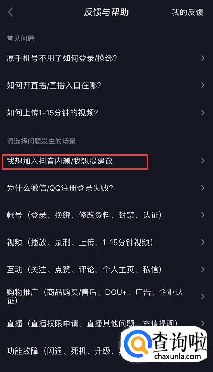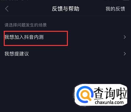 进入反馈与帮助页面后,找到“请选择问题发生的场景”,在下方点击【我想加入抖音内测/我想提建议】,然后在下一个页面选择【我想加入抖音内测】。