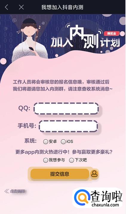 最后,我们根据要求输入QQ号、手机号,选择你的手机系统,然后点击【提交信息】,然后等待抖音审核通过之后就可以加入内测了。