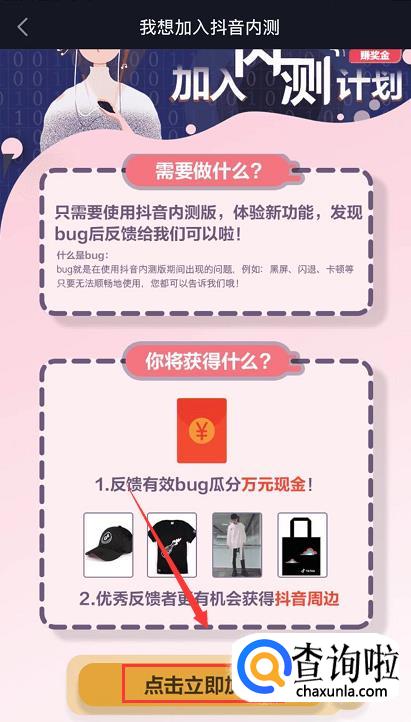在我想加入抖音内测页面可以看到有个活动,只需要使用抖音内测版,体验新功能,发现bug后反馈给系统即可。我们点击下方的【点击立即加入】。