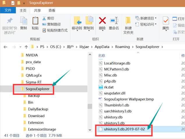 5、返回sogouexplorer文件夹,找到uhistroy3.db文件,点击将它删除。在空白处点击,键盘按住CTRL+v。