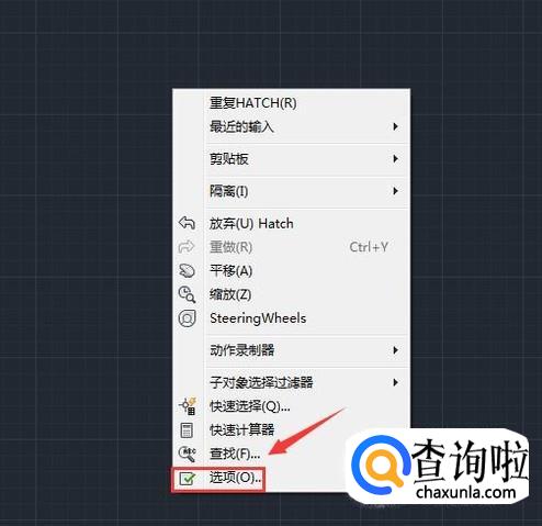 打开CAD之后我们在绘图区里的单击鼠标右键,在右键菜单哪里找到选项,如图所示: